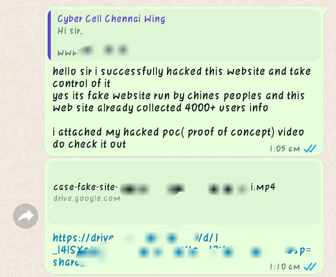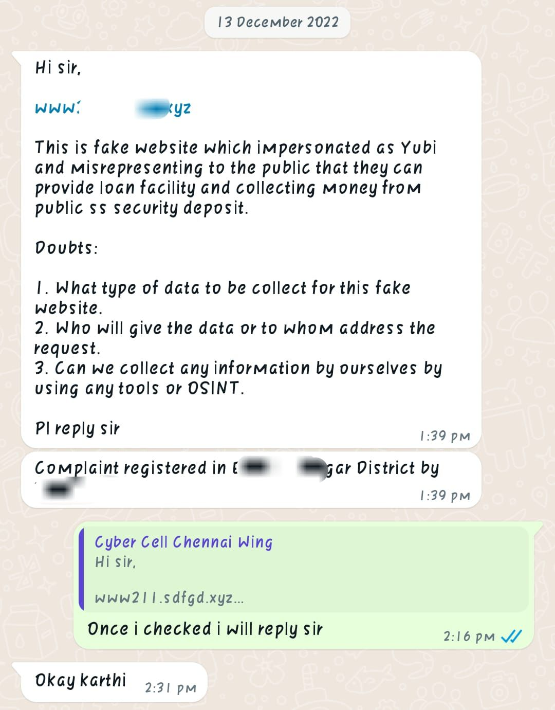 On December 13, I received a case through WhatsApp from the Chennai Cyber Cell. They wanted information about a suspicious website that was collecting money from people.